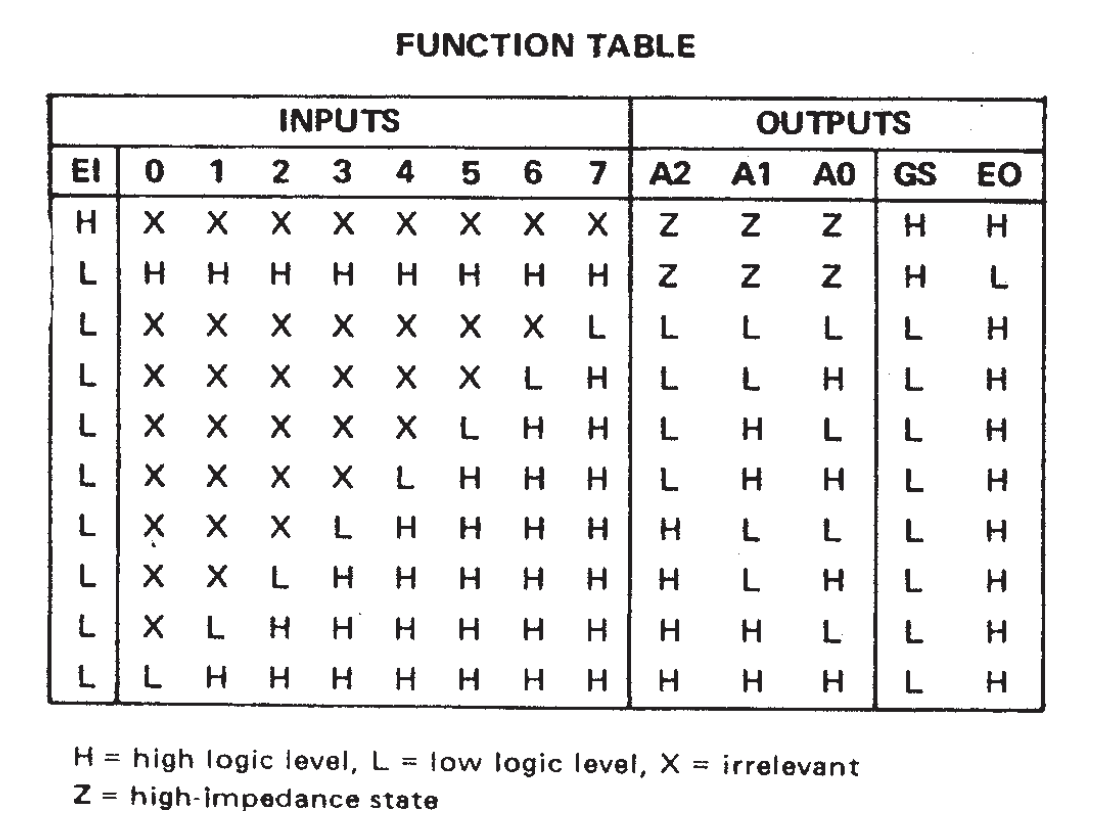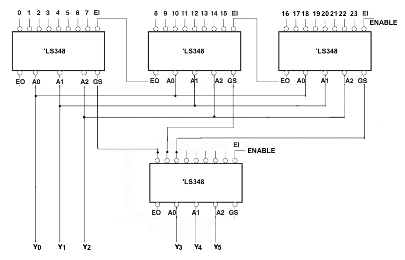 SN74LS348, com saídas tri-state(alta impedância), mostrados na Fig.1, é um circuito cujas entradas 0 até 23 são iguais à