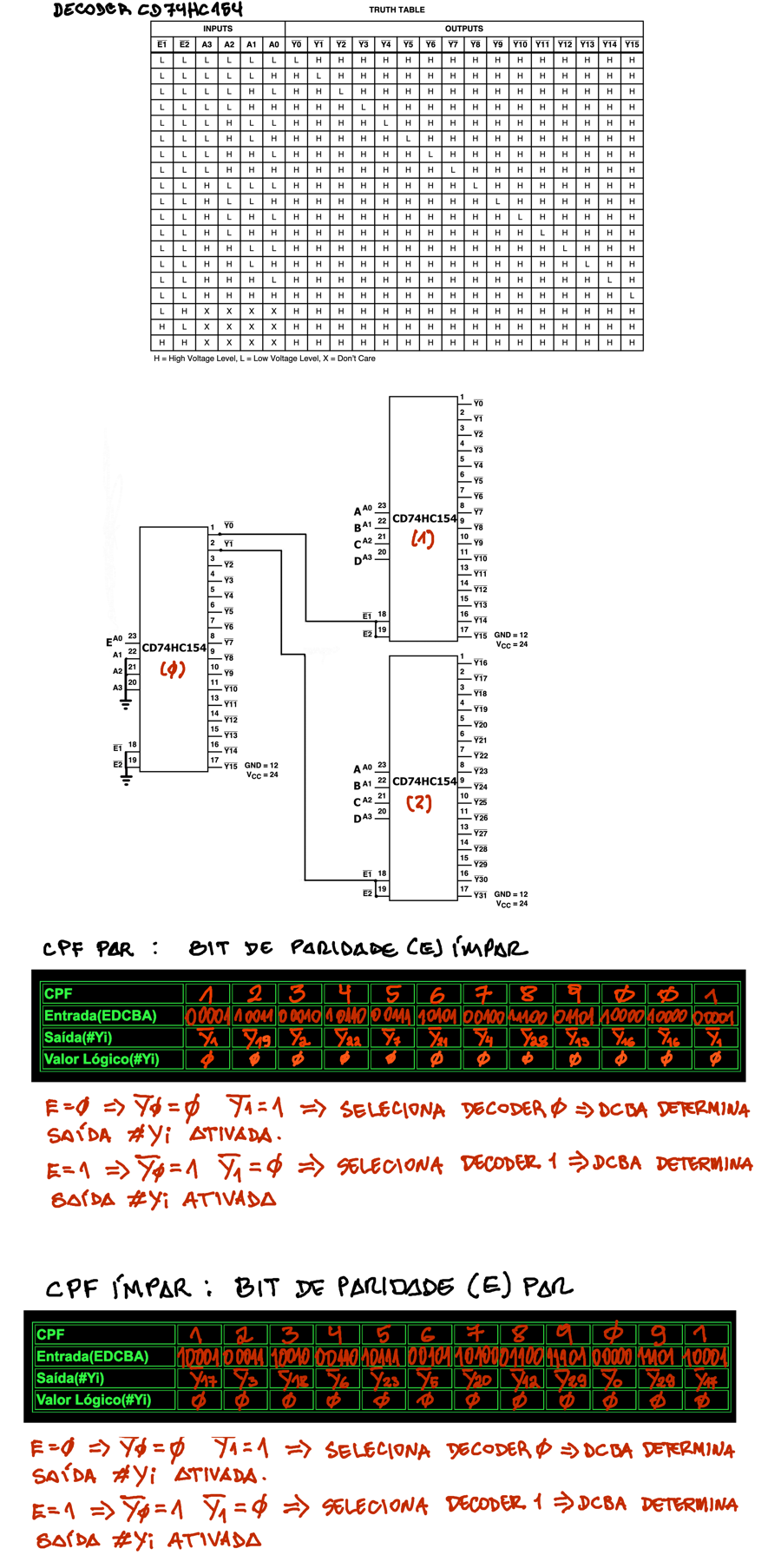 representação ASCII das três letras iniciais do seu nome, primeiro sobrenome, e segundo sobrenome, com paridade ímpar(CPF par) e paridade par(CPF ímpar), e o sinal de habilitação ENABLE está no nível lógico baixo(L). Determine os valores lógicos das saídas Y5 Y4Y