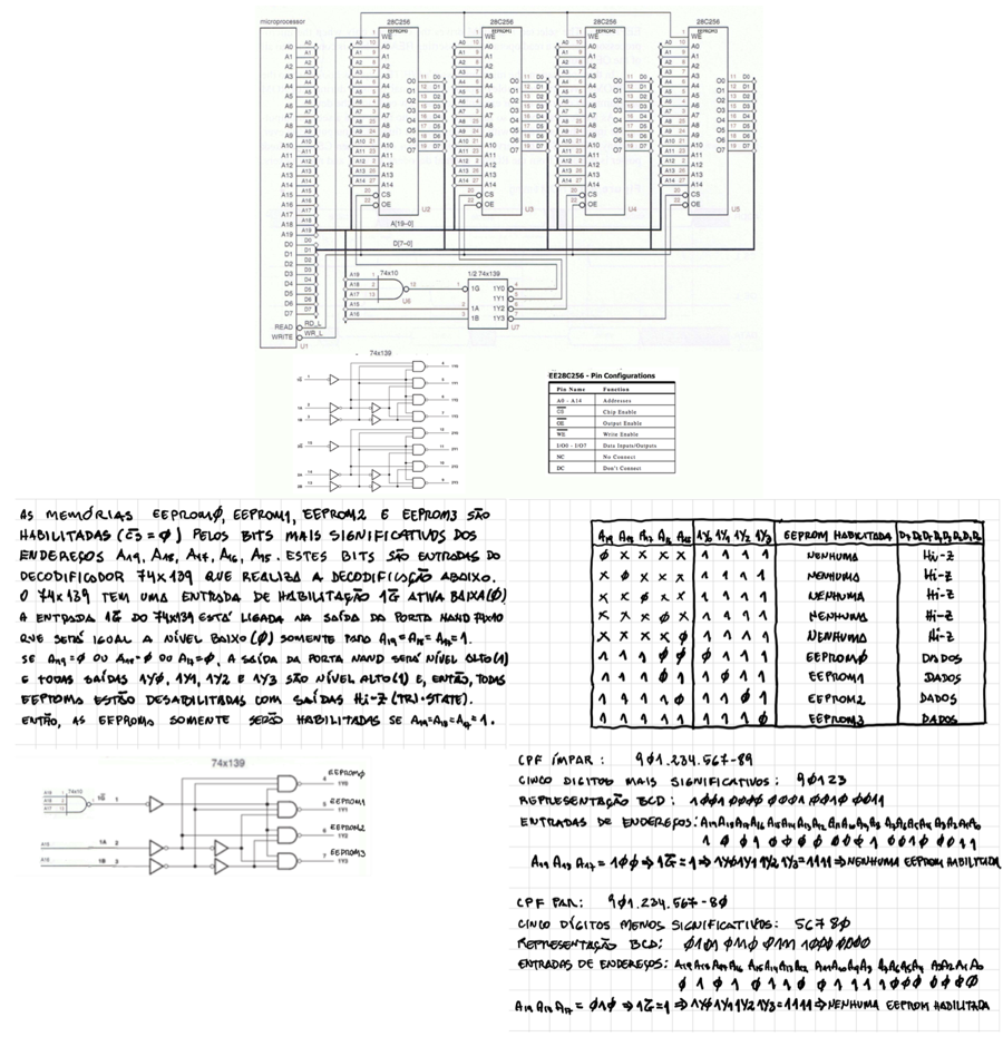 2. Para o arranjo de memórias mostrado na Fig.2, os bits das entradas de endereços A19A18A17A16A15A14A13A12A11A10A9A8A7A6A5A4A3A2A1A0 são iguais à representação BCD dos cinco dígitos mais significativos do seu CPF(para CPF ímpar) e iguais à representação BCD dos cinco dígitos menos significativos do seu CPF(para CPF par), do bit mais significativo para o bit menos significativo. Sabendo que o arranjo de memória está gravado conforme abaixo, diga qual o chip de memória EEPROM selecionado, o endereço inicial e final da EEPROM acessada e, então, determine os dados D7D6D5D4D3D2D1D0 presentes no barramento de dados, em binário. EEPROMs com saídas tri-state(Hi-Z).