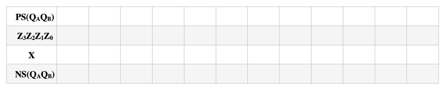 1. O circuito sequencial da FSM mostrado na Fig.1 tem uma entrada X e quatro saídas Z3Z2Z1Z0. Considere que o estado inicial da FSM é igual à QAQB=10(CPF par) e QAQB=01(CPF ímpar) e a sequencia em binário de X é igual `a representação BCD dos três dígitos mais significativos do CPF. Então, complete o preenchimento da tabela de transição da FMS.