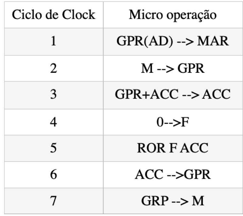 2. A tabela abaixo mostra uma sequencia de micro instruções executadas para a arquitetura da Fig.2. A locação de memória BCH tem a representação BCD dos três número mais significativos do CPF (CPF ímpar) e igual a representação BCD dos três número menos significativos do CPF (CPF par). Após a conclusão do micro programa, determine o conteúdo binário das posição da memória BCH, dos registradores ACC, F, GPR e MAR. Inicialmente, o conteúdo do registrador acumulador ACC é igual a 000H, o conteúdo do registrador GPR é igual a xBCH, onde x é don't care.