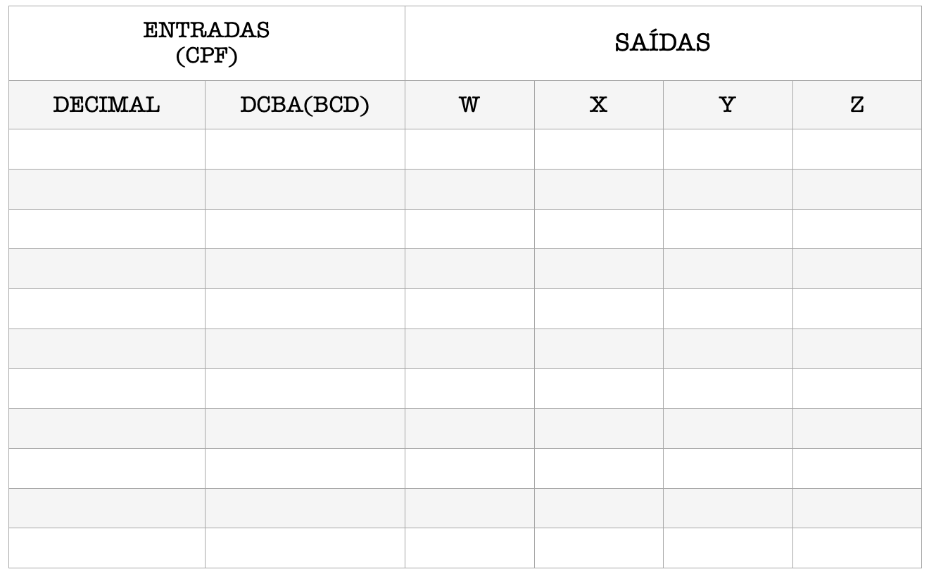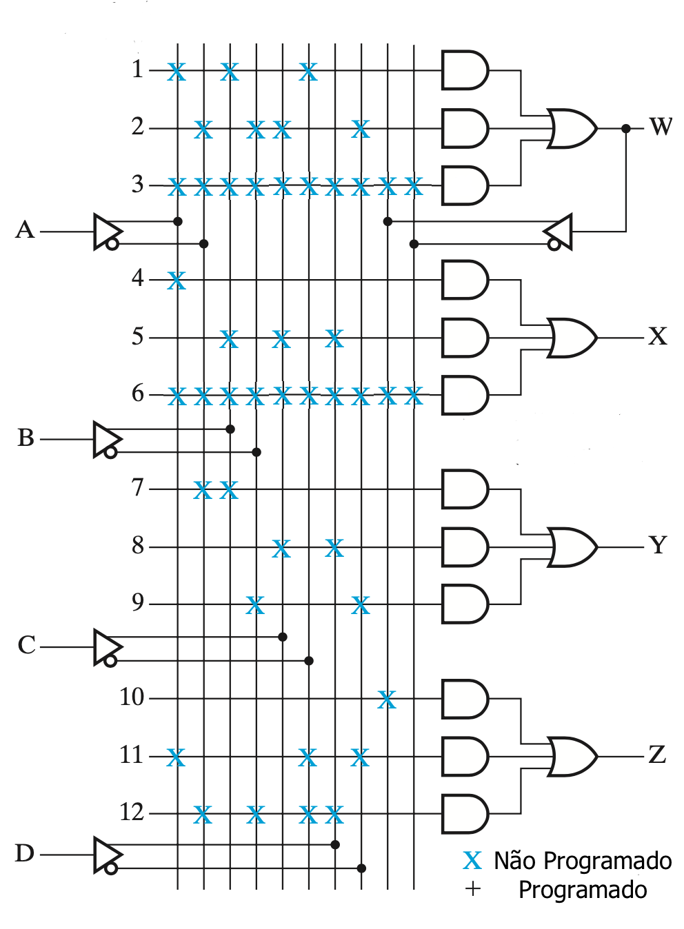 1.O circuito mostrado na Fig.1 representa um PAL programada. As variáveis de entrada DCBA são iguais aos números de seu CPF, codificados em código BCD, onde D é o MSD e A é o LSD. Então determine as funções de saídas W, X, Y e Z e preencha a tabela de programação do PAL para cada entrada DCBA, do número mais significativo para o número menos significativo do CPF.